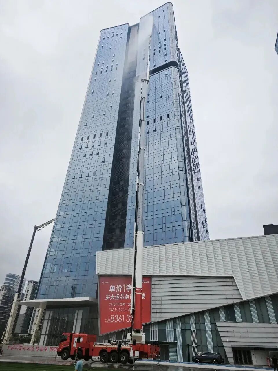 在“应急使命·2025”国家级综合演习中,JP100举高喷射消防车以全球最高超150米的喷射高度,凌空筑起“空中消防堡垒”,守护城市天际线。