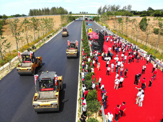 溧高高速南京段路面施工,是三一成套智能压实辅助系统在高速公路的首次应用,也使溧高高速南京段成为全国首条全部由国产智能化成套路机设备施工的高速公路,成为高速公路智能建造的新案例,吸引了参会代表纷纷来到现场观摩。此次参与施工的智能路面成套摊压设备全部是三一C8系列产品,其具有代表性的三一黄为溧高高速注入了别样风景。它们是专为高等级路面大宽度、大厚度摊铺压实作业研制开发,并都搭载了三一智能压实辅助系统。施工现场,两台三一12米大宽度C8摊铺机SAP120C-8并行摊铺,两台30吨SPR300C-8轮胎压路机、5台13吨STR130C-8双钢轮压路机紧随其后,来回压实路面,场面壮观,气氛热烈。