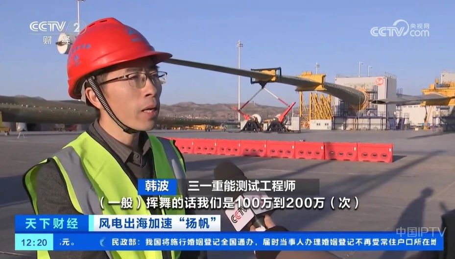 三一重能测试工程师 韩波:出口叶片,我们要进行25年(服役标准)的一个疲劳测试。一般(挥舞)的话我们是100万到200万(次),然后摆振的话,我们一般是300万到400万(次),保证它(运行)的一个可靠性。
