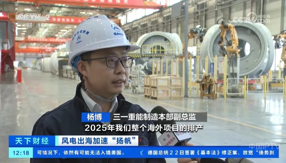 三一重能制造本部副总监 杨博:2025年我们整个海外项目的排产相较于2024年要翻了三番。可以兼容从3兆瓦到15兆瓦机型的柔性生产,目前已经可以做到三小时就可以下线一台(风机)的交付速度。