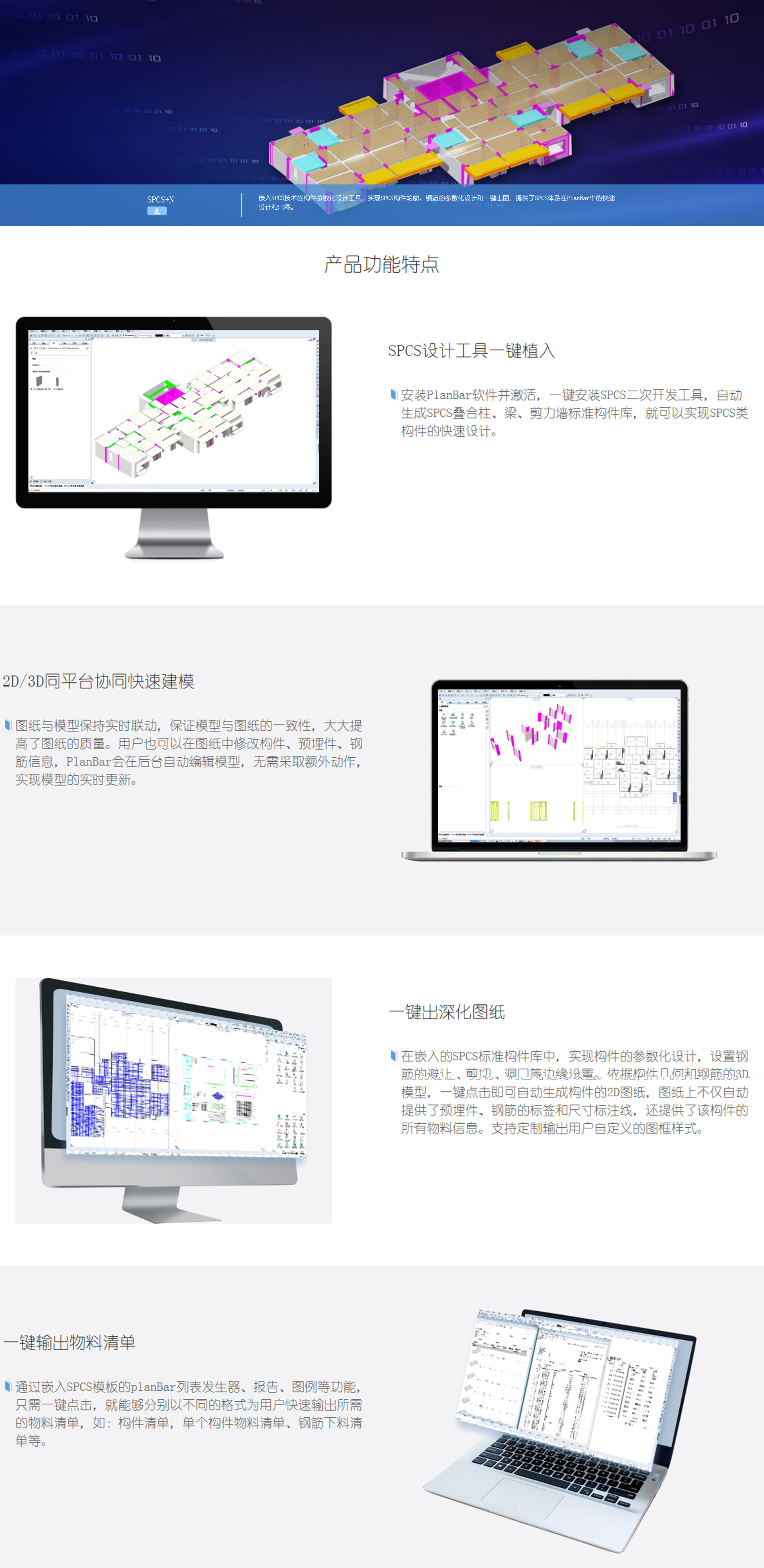 三一筑工P/N/R+SPCS系列智能设计软件,嵌入SPCS结构技术专利,满足墙柱梁板全预制、地上地下全装配的设计要求,实现快速模型创建、自动拆分设计、智能配筋设计、一键输出图纸、BOM清单、模型和加工数据,为构件生产、施工提供数据支持。从而解决行业内BIM设计协同难、数据散、应用低等痛点问题,有效的缩短设计周期、提高设计质量,节约人工成本,让装配式建筑设计更好更快更轻松。