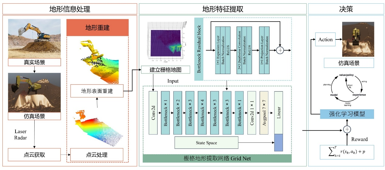 传统的无人挖掘技术依赖于专家经验和动态规划,但在效率和泛化性上存在局限。E-GTN框架通过地形特征提取和多模态融合技术,基于强化学习和大模型架构,显著提升了无人挖掘的决策能力和环境适应性。该框架包括地形信息处理、地形特征提取和决策三部分。