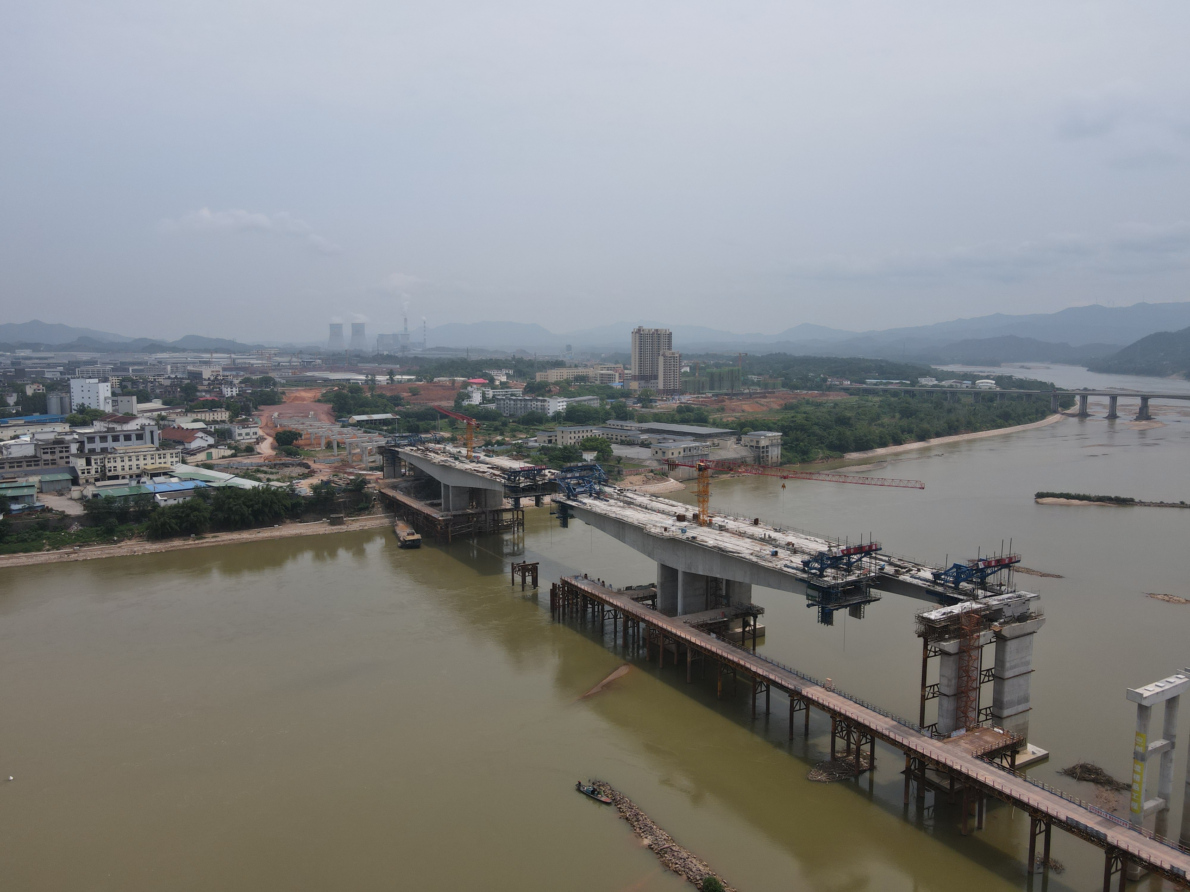 汶潭大桥长约1240米,连接着赣县义源新区与洋塘片区。此次施工位于贡江中间,跨度极大,且风力不定,加上桥下仍需要通船,这些因素对两台SFT160C2(T6518-10)平头塔机的稳定性和安全性提出了严格的要求。
