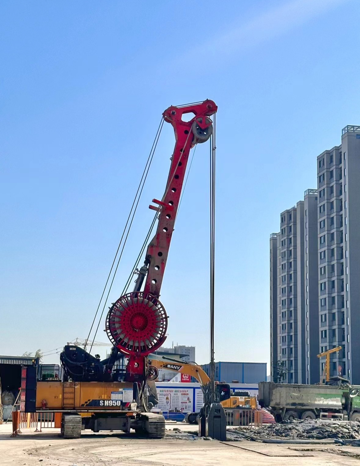 墙厚1m、宽度6.8m、深度56m,共70多幅墙。由于地层复杂、难度大、工期紧,客户选用三一抓斗SH950一抓到底。
