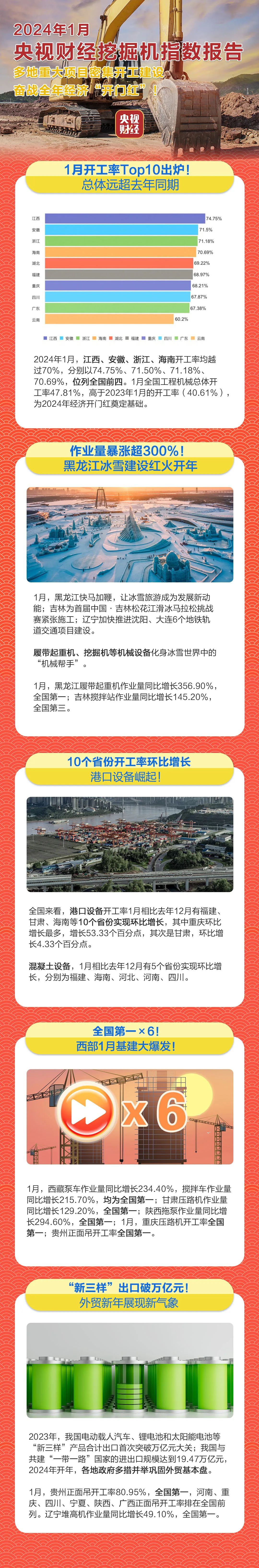挖掘机是基础设施建设的“标配”,是反映基础设施建设、观察固定资产投资等经济变化的风向标。央视财经与三一重工、树根互联联合打造的“央视财经挖掘机指数”发布了最新相关数据。新年伊始,我国多地重大项目建设密集开工,奋战全年经济“开门红”。多个省份稳定经济运行的压舱石作用持续凸显。