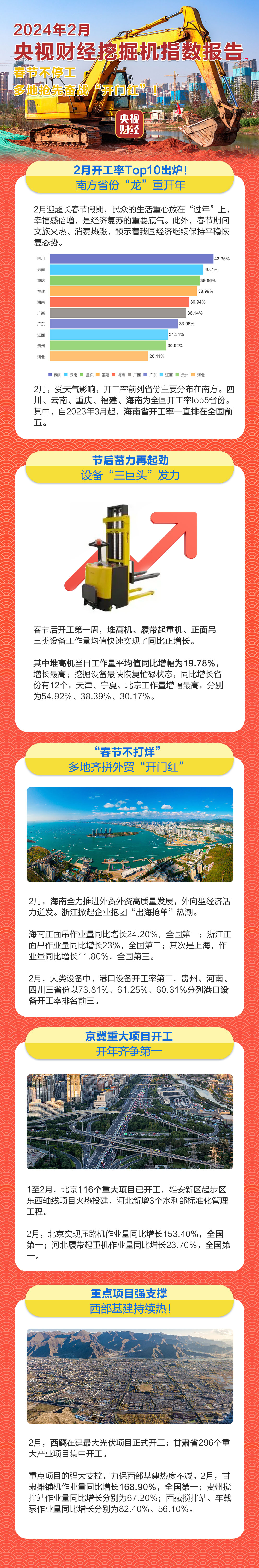 挖掘机是基础设施建设的“标配”,是反映基础设施建设、观察固定资产投资等经济变化的风向标。央视财经与三一重工、树根互联联合打造的“央视财经挖掘机指数”发布了最新相关数据。春节前后多地重大项目不停工,抢先奋战“开门红”。
