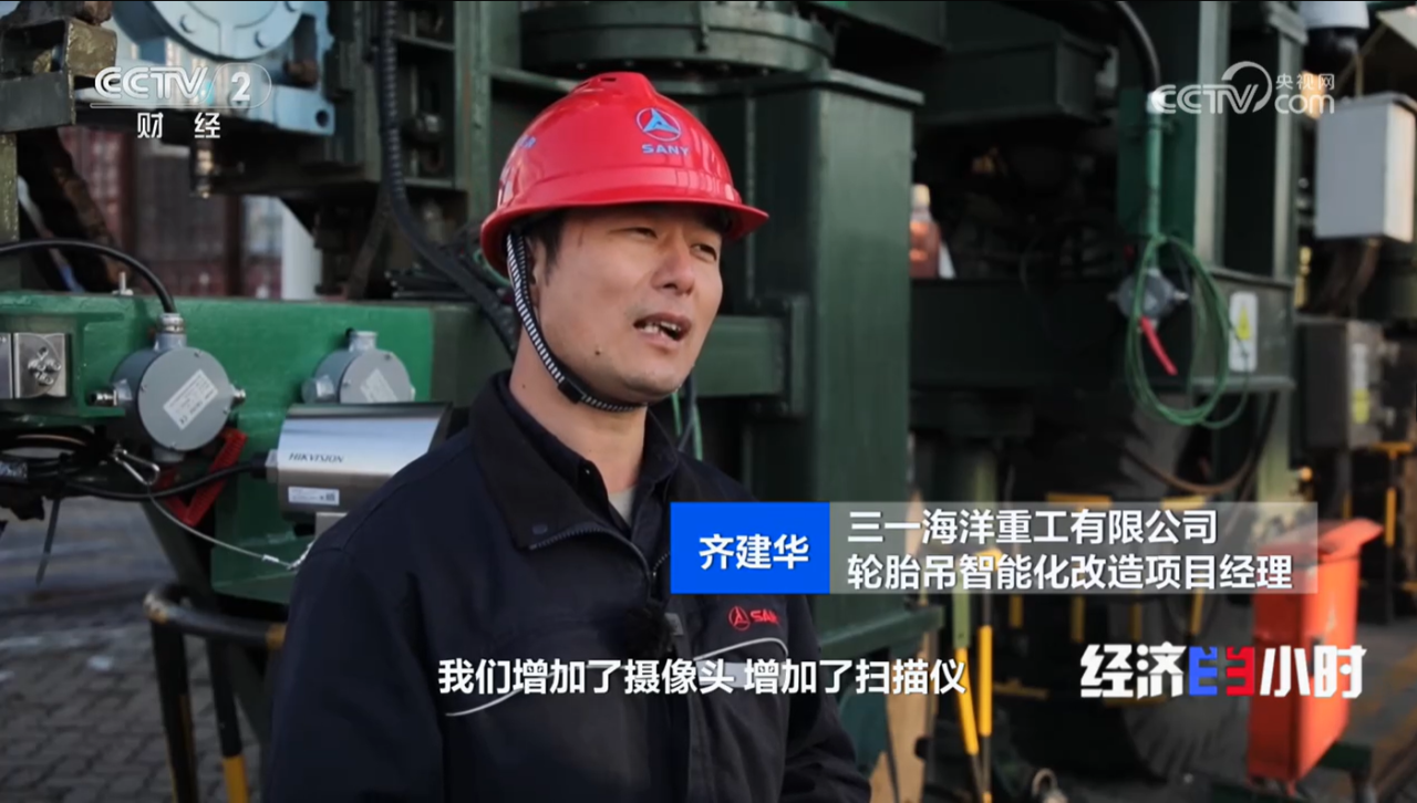三一海洋重工有限公司轮胎吊智能化改造项目经理 齐建华:我们增加了摄像头,增加了扫描仪,通过视觉这些激光扫描技术,通过远程自动化,就好像人的眼睛一样,实现它的自动化装放箱。
