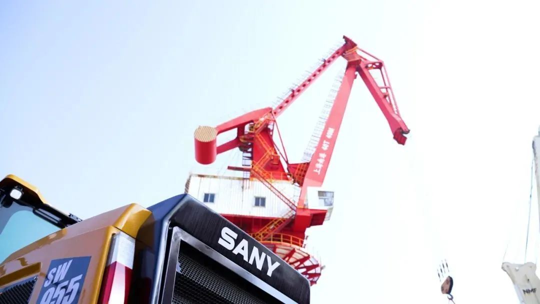 长龙一侧,巍然伫立着两台红色的三一40T-40M全变幅门座式起重机,它们正有条不紊地忙碌着。